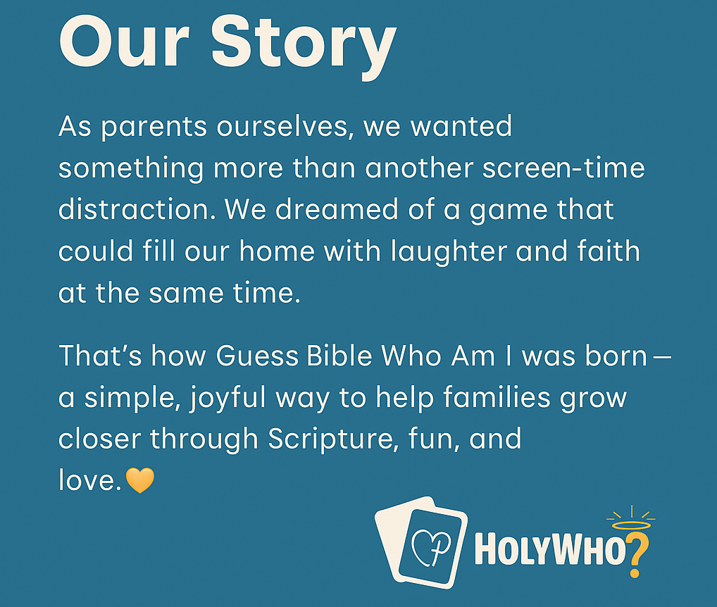 Every card and question in HolyWho is designed to help kids connect play with Scripture. As they laugh and guess, they also remember the stories and values that build a stronger faith foundation.